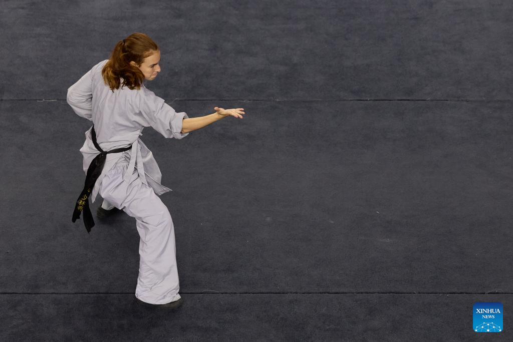 An athlete performs during the National Wushu Championships of Argentina in Buenos Aires, Argentina, on June 15, 2025. (Xinhua/Meng Dingbo)