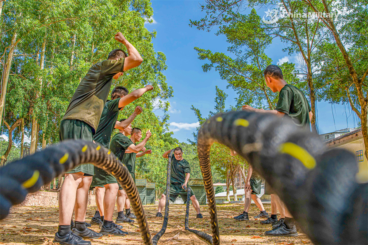 Soldiers assigned to a mobile detachment of the Chinese People's Armed Police (PAP) Guangxi Corps perform battle ropes waves to build upper body muscles during a multi-subject physical exercise on June 10, 2025. (eng.chinamil.com.cn/Photo by Liu Ming)