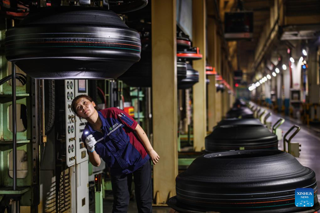 A worker works at a tire production plant in Rongcheng City, east China's Shandong Province, June 16, 2025. China's value-added industrial output expanded 5.8 percent year on year in May. China's economy continued to expand steadily in May, supported by ongoing policy measures that helped sustain recovery amid global uncertainties, official data showed on Monday. (Photo by Li Xinjun/Xinhua)