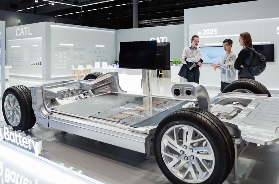 People visit the booth of CATL at the Automechanika in Frankfurt, Germany, Sept. 11, 2024. (Xinhua/Zhang Fan)