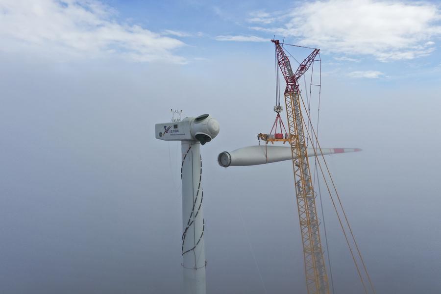 Photo taken on Sept. 27, 2020 shows the lifting operation at the construction site of the 156 Megawatt (MW) Senj Wind Farm project in Senj, Croatia. (Photo by Ding Decai/Xinhua)