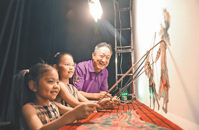 Hou Jianchuan performs Xiaoyi shadow puppetry together with children. (People's Daily Online/Wang Fan)