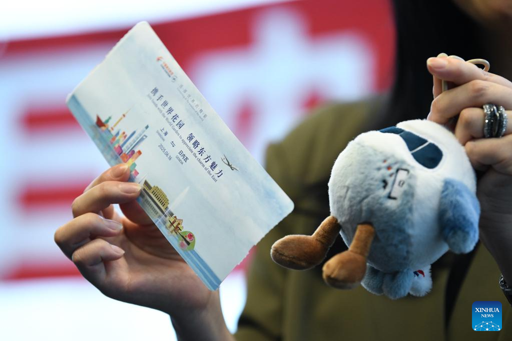 A passenger displays a special boarding card and a stuffed toy designed in commemoration of China Eastern Airlines' inaugural direct flight linking Shanghai with Geneva in Geneva, Switzerland, June 16, 2025. (Xinhua/Lian Yi)