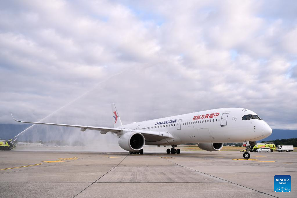 China Eastern Airlines' inaugural direct flight linking Shanghai with Geneva lands in Geneva, Switzerland, June 16, 2025. (Xinhua/Lian Yi)