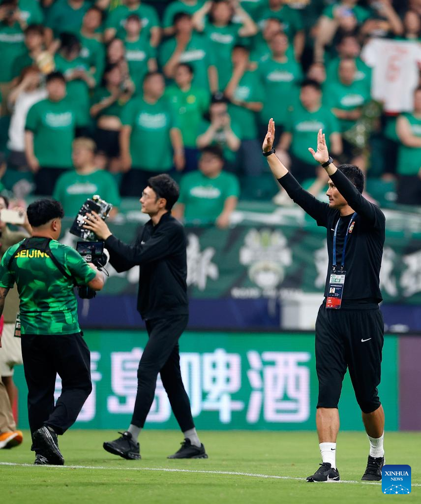 Shao Jiayi (R), head coach of Qingdao West Coast and Yang Zhi (C), goalkeeper coach of Qingdao West Coast greet the audiences after the 6th round match between Beijing Guoan and Qingdao West Coast at the 2025 season Chinese Football Super League (CSL) in Beijing, capital of China, June 17, 2025. (Xinhua/Wang Lili)