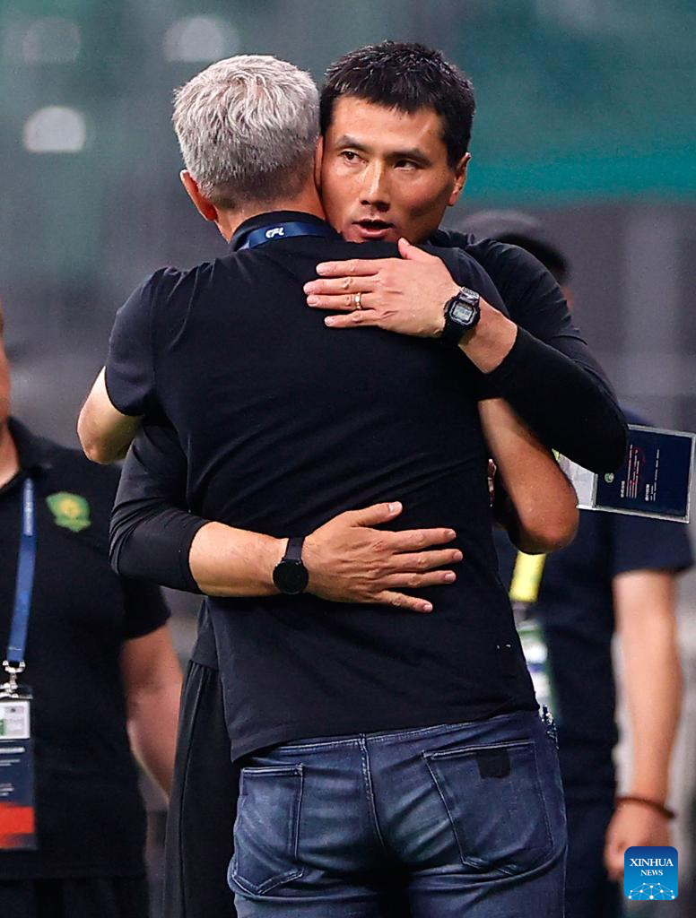 Shao Jiayi (R), head coach of Qingdao West Coast hugs with Quique Setien, head coach of Beijing Guoan after the 6th round match between Beijing Guoan and Qingdao West Coast at the 2025 season Chinese Football Super League (CSL) in Beijing, capital of China, June 17, 2025. (Xinhua/Wang Lili)