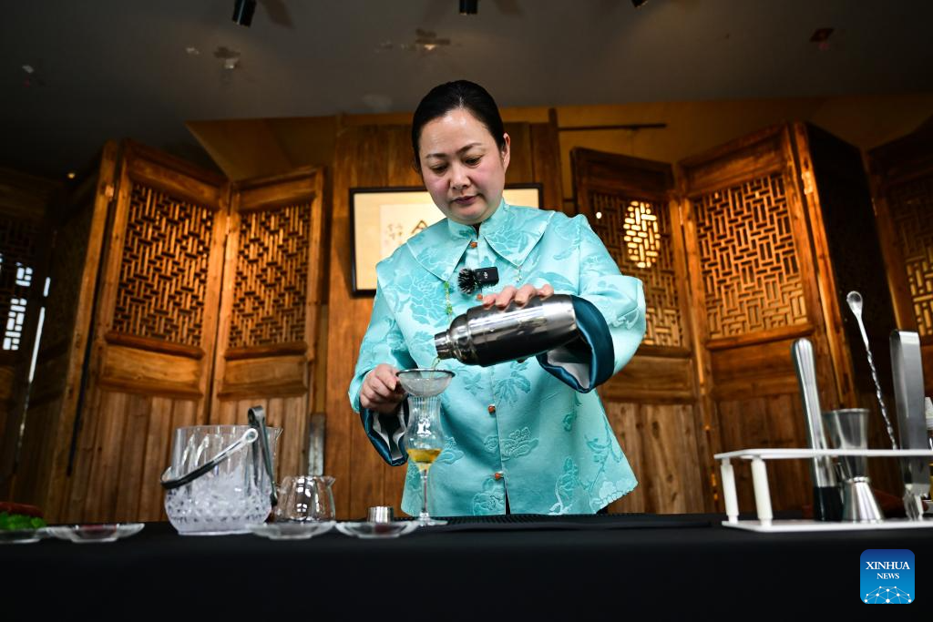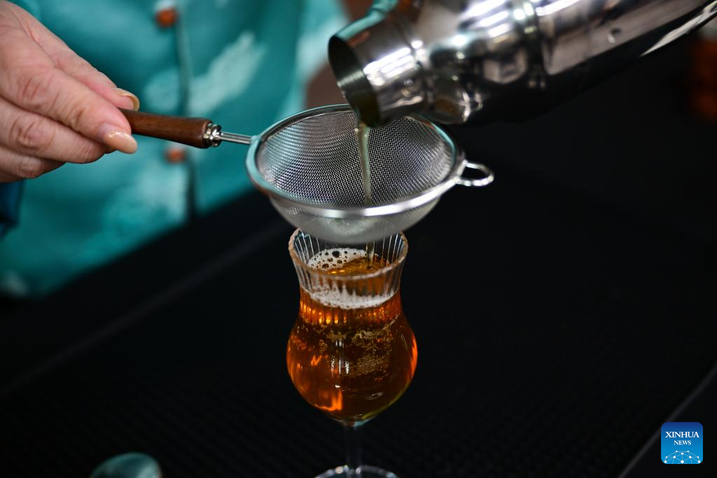 Wang Sun, founder of a tea art vocational training school, makes a tea beverage in Huangshan, east China's Anhui Province, April 15, 2025.