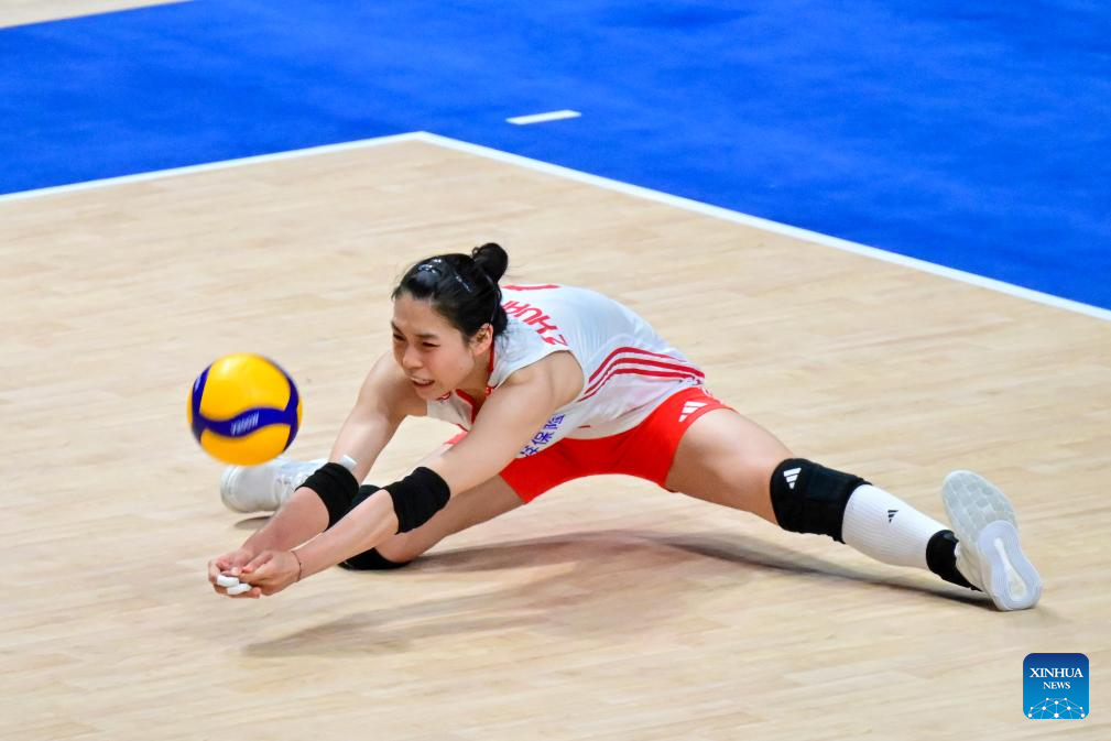 Zhuang Yushan of China saves the ball during the Pool 5 match between China and Bulgaria at the Women's Volleyball Nations League (VNL) 2025 in Hong Kong, south China, June 19, 2025. (Xinhua/Zhu Wei)