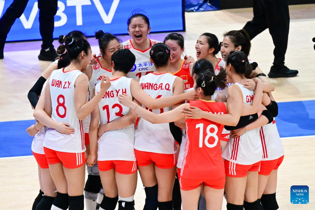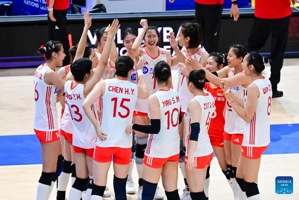 Players of China celebrate during the Pool 5 match between China and Bulgaria at the Women's Volleyball Nations League (VNL) 2025 in Hong Kong, south China, June 19, 2025. (Xinhua/Zhu Wei)