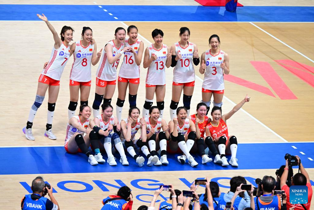 Players of China pose for photos after the Pool 5 match between China and Bulgaria at the Women's Volleyball Nations League (VNL) 2025 in Hong Kong, south China, June 19, 2025. (Xinhua/Zhu Wei)