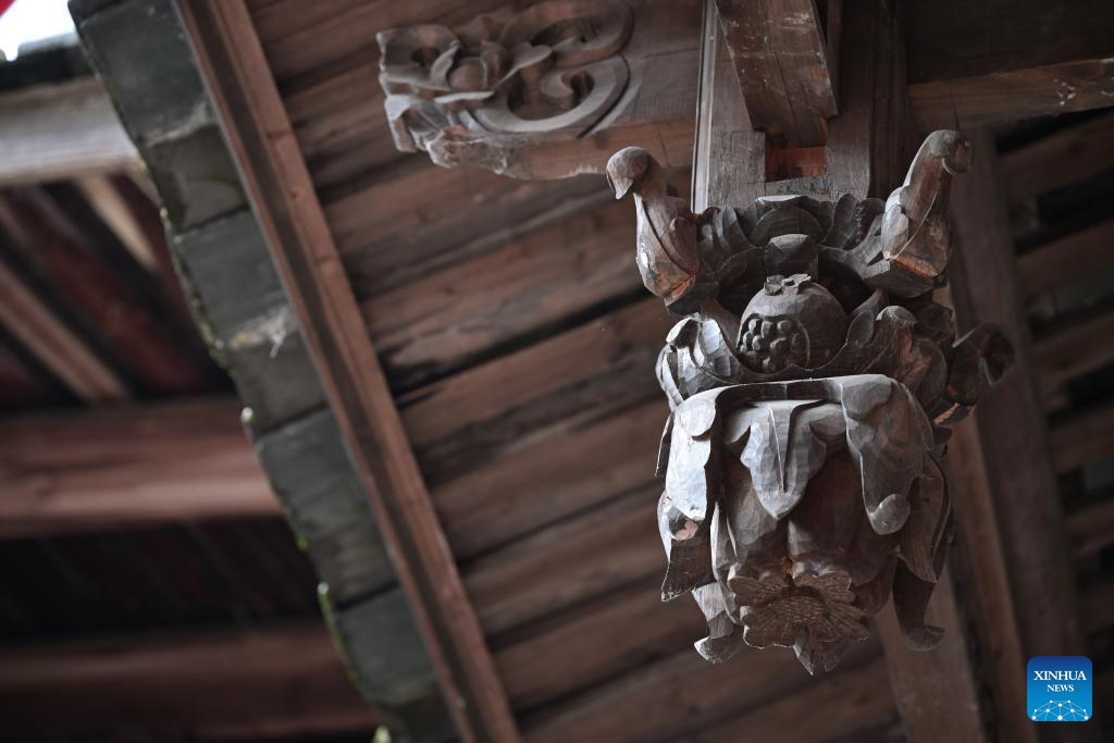 This photo taken on May 20, 2025 shows timber structural elements of a fortified manor in Yongtai County, southeast China's Fujian Province. Nestled in the Daiyun Mountain like scattered pearls, over 2,000 fortified manors in Yongtai County trace their origins to the Tang Dynasty (618-907 AD), flourishing later during the Ming (1368-1644) and Qing (1644-1911) eras.