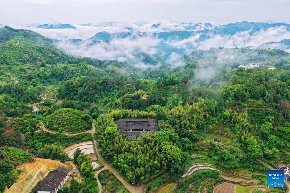 An aerial drone photo taken on May 20, 2025 shows Beishan Manor in Yongtai County, southeast China's Fujian Province. Nestled in the Daiyun Mountain like scattered pearls, over 2,000 fortified manors in Yongtai County trace their origins to the Tang Dynasty (618-907 AD), flourishing later during the Ming (1368-1644) and Qing (1644-1911) eras.