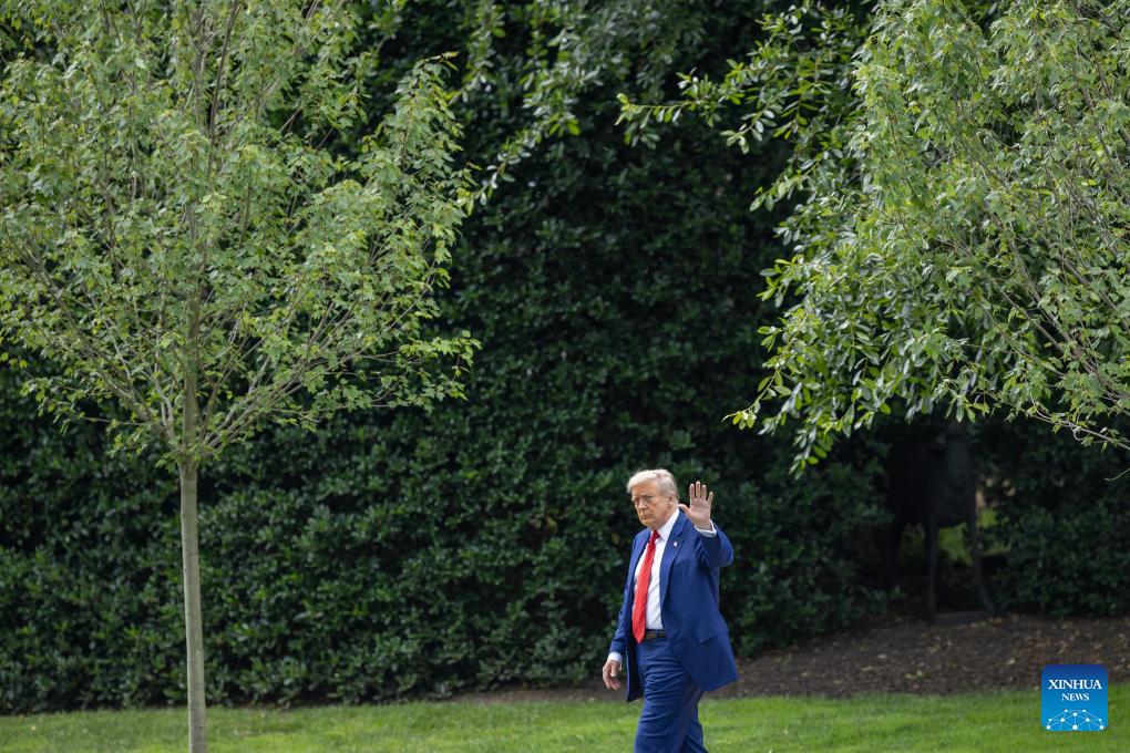 U.S. President Donald Trump waves to the press as he walks toward the South Lawn to board Marine One at the White House in Washington, D.C., the United States, on June 20, 2025. Trump said Friday it will be difficult to request Israel stop its airstrikes in Iran, even as he pursues a diplomatic solution to end the conflict. (Xinhua/Hu Yousong)