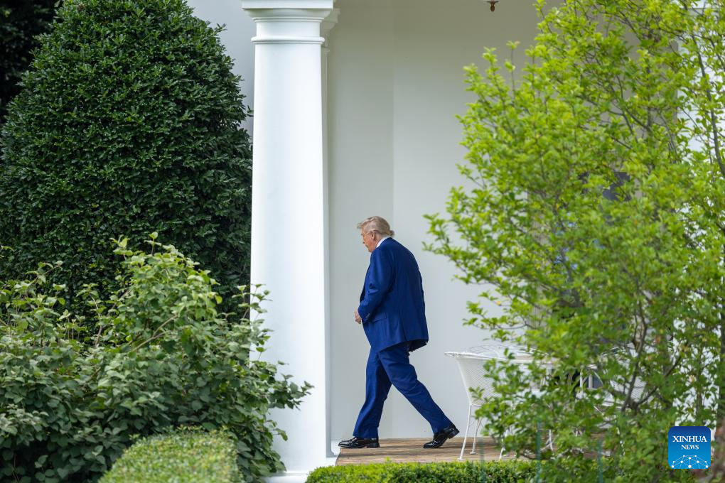 U.S. President Donald Trump walks toward the South Lawn to board Marine One at the White House in Washington, D.C., the United States, on June 20, 2025. Trump said Friday it will be difficult to request Israel stop its airstrikes in Iran, even as he pursues a diplomatic solution to end the conflict. (Xinhua/Hu Yousong)