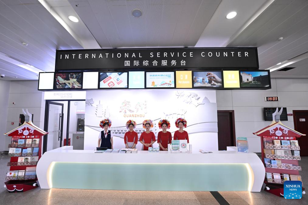Staff members welcome passengers at the newly established International Service Counter at Quanzhou Jinjiang International Airport in Quanzhou, southeast China's Fujian Province, on June 20, 2025. Quanzhou City on Friday issued a guide to Quanzhou for expats and a travel guide for 240-hour visa-free transit in the city.