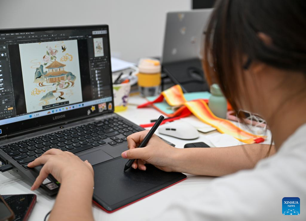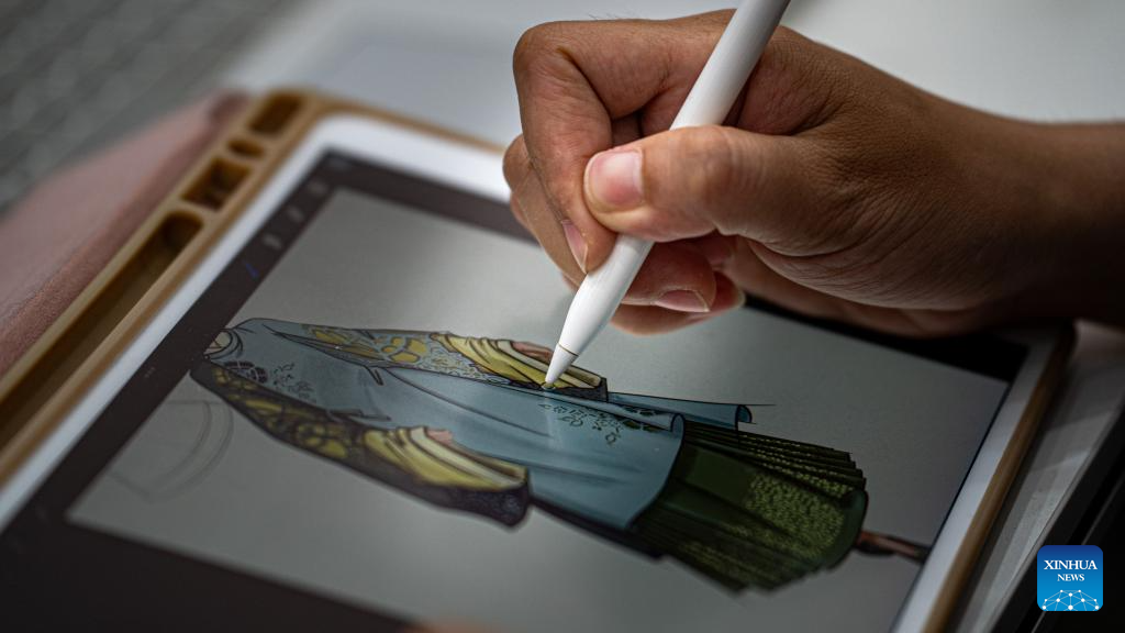 A staff member designs patterns for horse-face skirt, or Mamianqun, at a Hanfu design studio in Caoxian County, east China's Shandong Province, June 18, 2025. (Xinhua/Xu Jiayi)