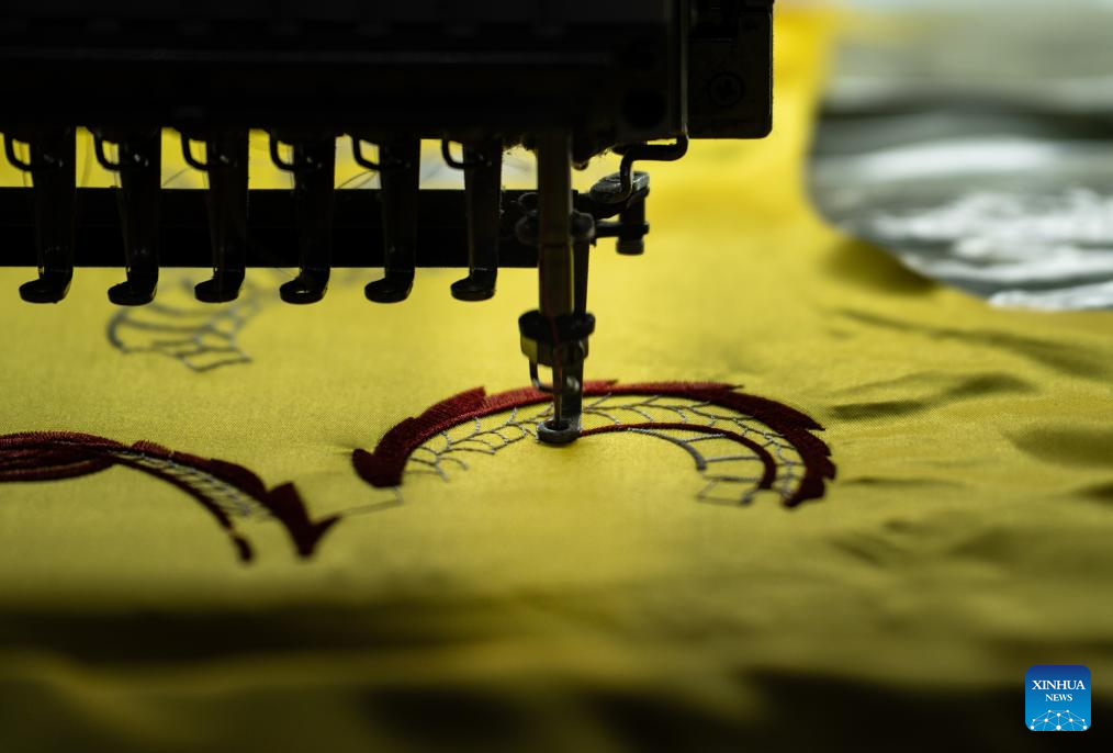 An embroidery machine is seen at work in an embroidery enterprise in Caoxian County, east China's Shandong Province, June 19, 2025. (Xinhua/Shao Zedong)