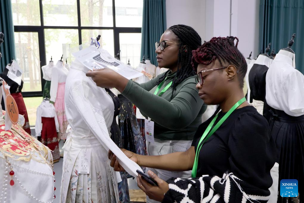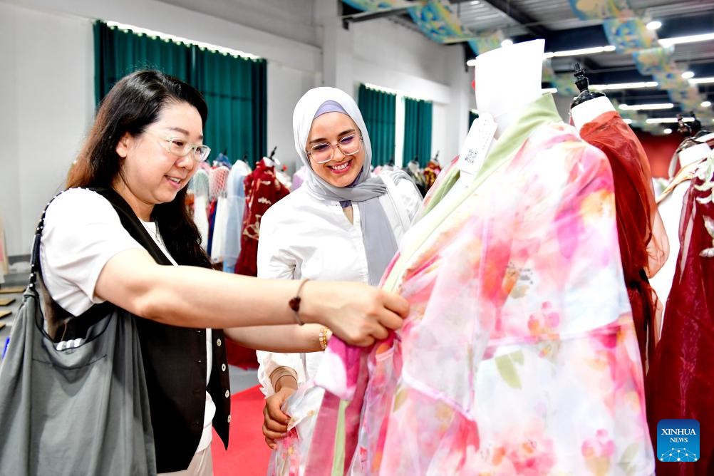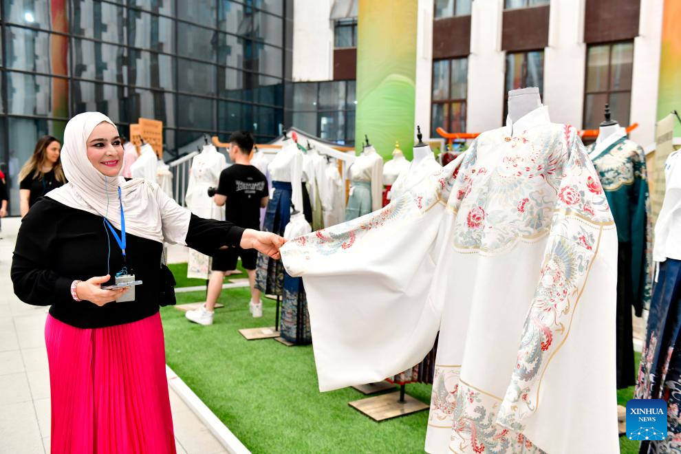 A participant of a training course hosted by China Woman's University views Hanfu at a digital economy industrial park in Caoxian County, east China's Shandong Province, June 19, 2025. (Xinhua/Guo Xulei)