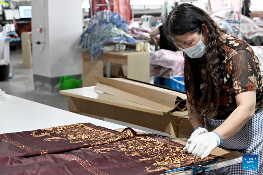A staff member works on a piece of horse-face skirt, or Mamianqun, at a technology industrial park in Caoxian County, east China's Shandong Province, June 17, 2025. (Xinhua/Sui Shangjun)