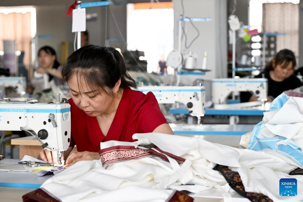 Staff members make Hanfu at a technology industrial park in Caoxian County, east China's Shandong Province, June 17, 2025. (Xinhua/Sui Shangjun)