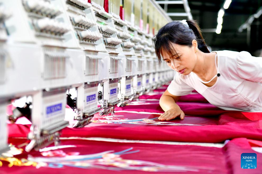 A staff member monitors the work of embroidery machines in an embroidery enterprise in Caoxian County, east China's Shandong Province, June 19, 2025. (Xinhua/Guo Xulei)