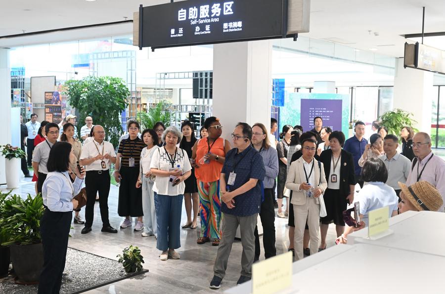 Librarians from China and abroad participating in an exchange program visit the self-service area of Fujian Provincial Library in Fuzhou, southeast China's Fujian Province, June 21, 2025. (Xinhua/Lin Shanchuan)