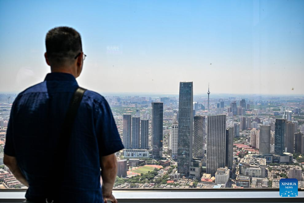 A visitor overlooks Tianjin's cityscape at "the Summit of Tianjin" sightseeing hall of Tianjin World Financial Center (TWFC) in Tianjin, north China, June 22, 2025.