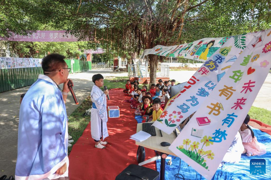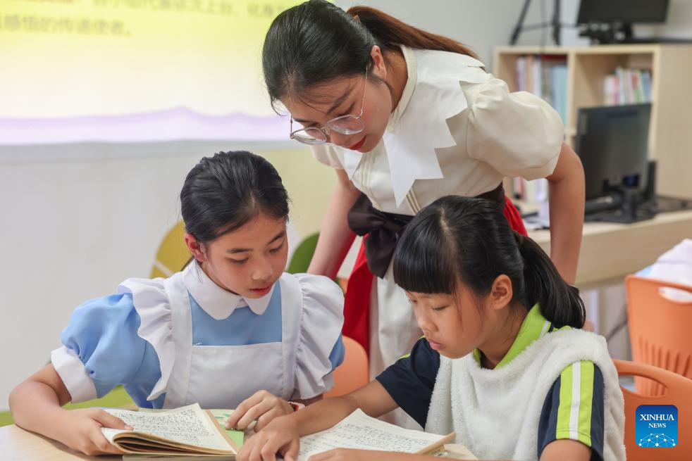 Students has a fairy tail reading class in the Experimental Primary School in Hanlin Town of Ding'an County, south China's Hainan Province, June 20, 2025. Teachers in the school organized role-playing activities and interactive discussions to generate students' enthusiasm for reading. (Xinhua/Zhang Liyun)