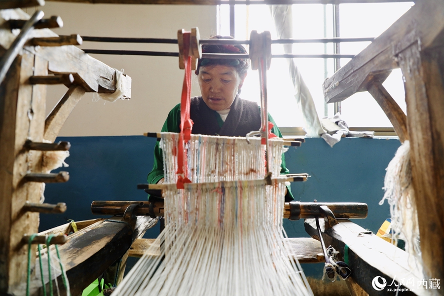 National role model worker Tenzin Drolkar weaves traditional aprons at her loom at an apron cooperative in Jedeshol town, Gonggar county, Shannan city, southwest China's Xizang Autonomous Region. As colorful threads fly, a Tibetan apron known as "Bangdian" takes shape beneath her skilled hands.