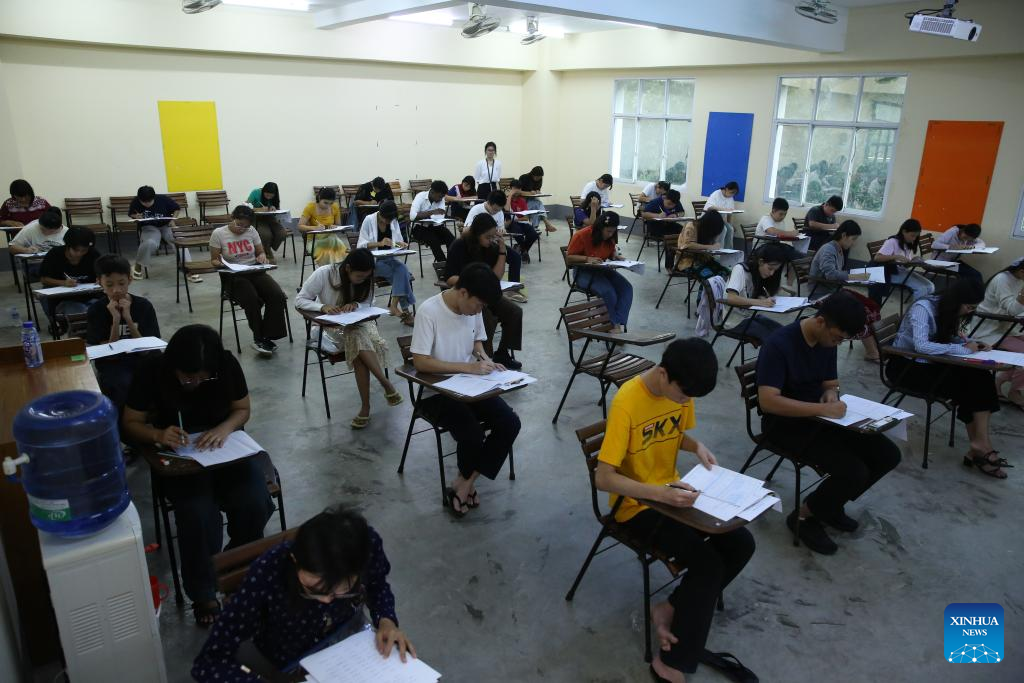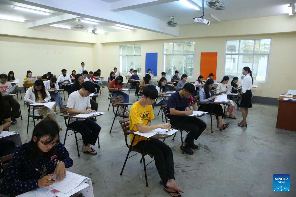 Students take the Hanyu Shuiping Kaoshi (HSK), or the Chinese Proficiency Test, at Myanmar's Yangon University in Yangon, Myanmar, June 22, 2025. The test organized by the Le Hua International Education Center was conducted at Myanmar's prestigious Yangon University for the first time on Sunday. A total of 200 students from Chinese language schools across the country sat for the exam, taking levels from HSK 1 to HSK 6. (Xinhua/ Myo Kyaw Soe)