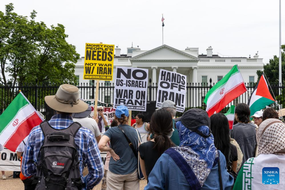 Protesters rally outside the White House to denounce U.S. air strikes on Iran's nuclear facilities, in Washington, D.C., the United States, on June 22, 2025. (Xinhua/Hu Yousong)