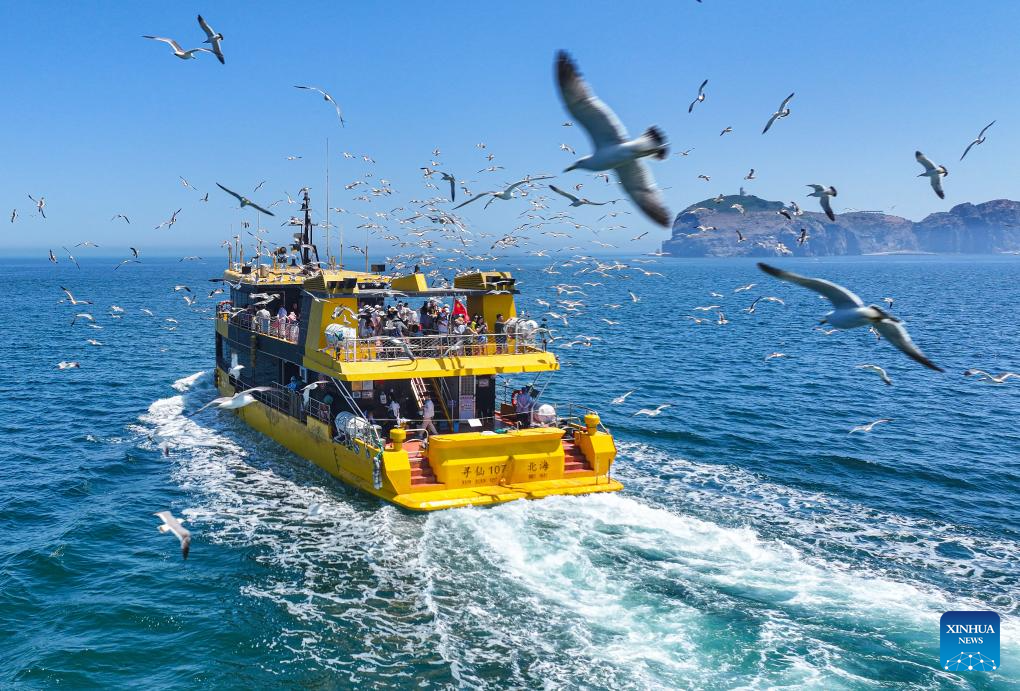 A drone photo taken on June 23, 2025 shows tourists enjoying a boat tour in Rongcheng City, east China's Shandong Province. (Photo by Li Xinjun/Xinhua)