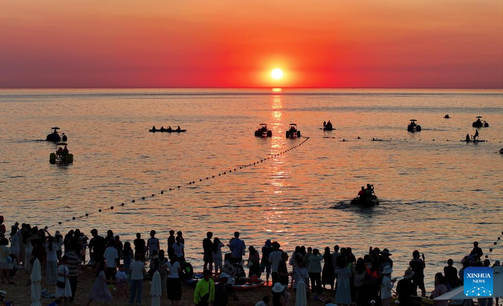 Tourists enjoy themselves at sunset on the beach in Weihai City, east China's Shandong Province, June 22, 2025. (Photo by Zhu Chunxiao/Xinhua)