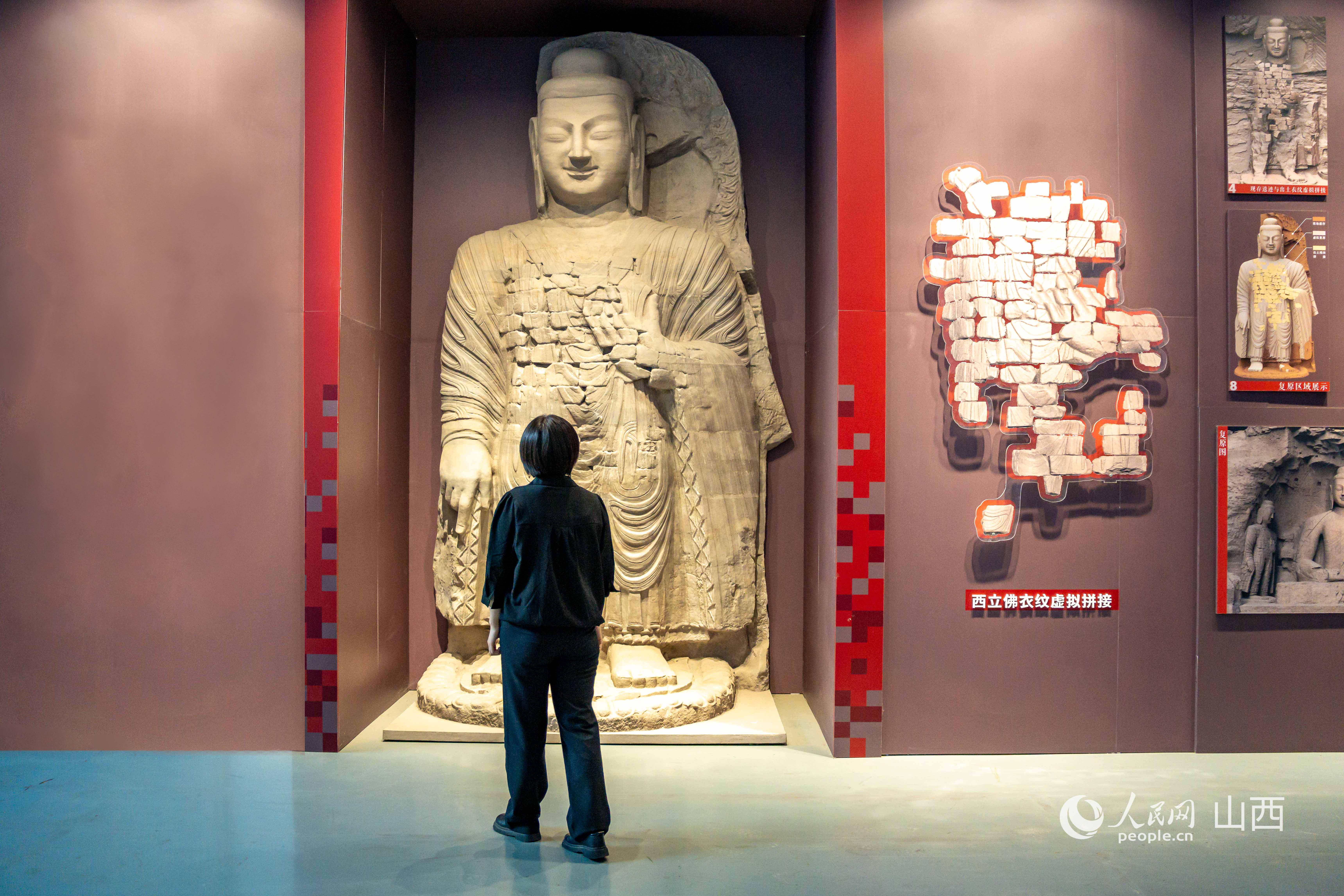 A visitor observes a replica of a Buddha statue from the Yungang Grottoes. (People's Daily Online/Ma Mengdi)