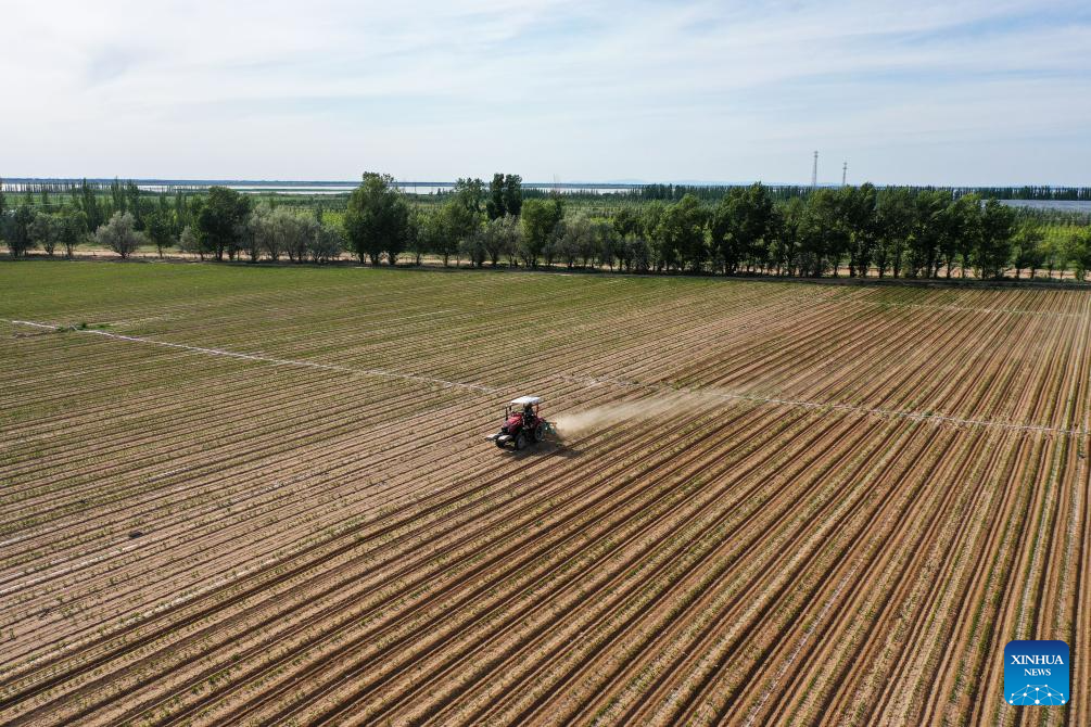 A farmer operates agricultural machinery in farmlands in Urad Front Banner of Bayannur, north China's Inner Mongolia Autonomous Region, June 4, 2025. (Xinhua/Li Zhipeng)