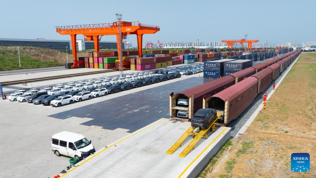 Staff members load cars for export into a carriage of a special-purpose train at the Paihe Port railway logistics base in Hefei, east China's Anhui Province, June 17, 2025. Anhui Province takes advantage of convenient transportation infrastructure such as railway freight stations and ports along the Yangtze River to vigorously promote logistics development and local consumption. (Xinhua/Zhou Mu)