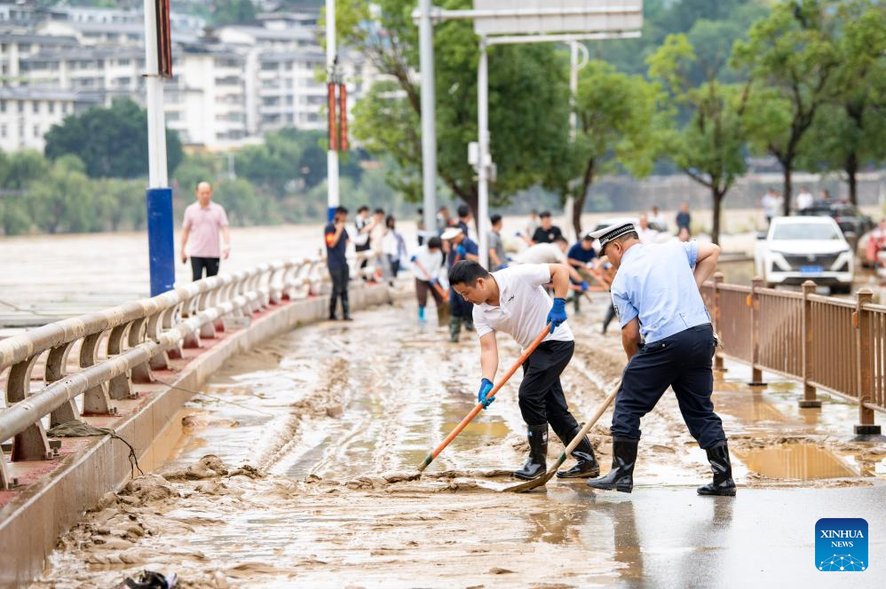 People clear silt on the road in Congjiang County, southwest China's Guizhou Province, June 25, 2025. Continuous heavy rainfall and upstream inflows have triggered severe flooding in two counties of Guizhou Province in southwest China, prompting mass evacuations.