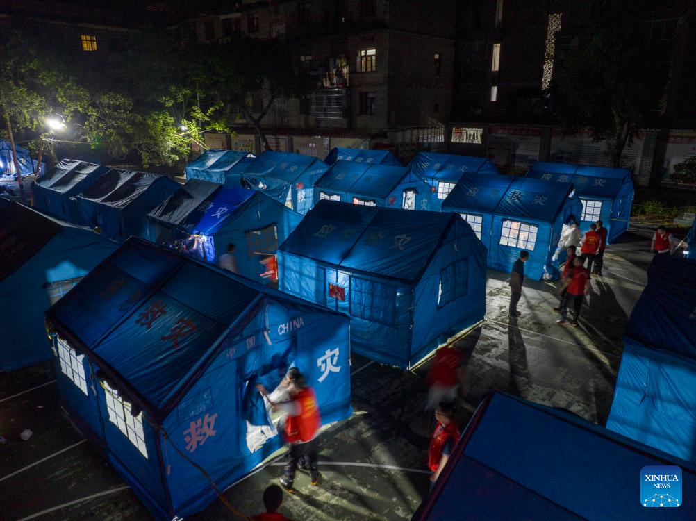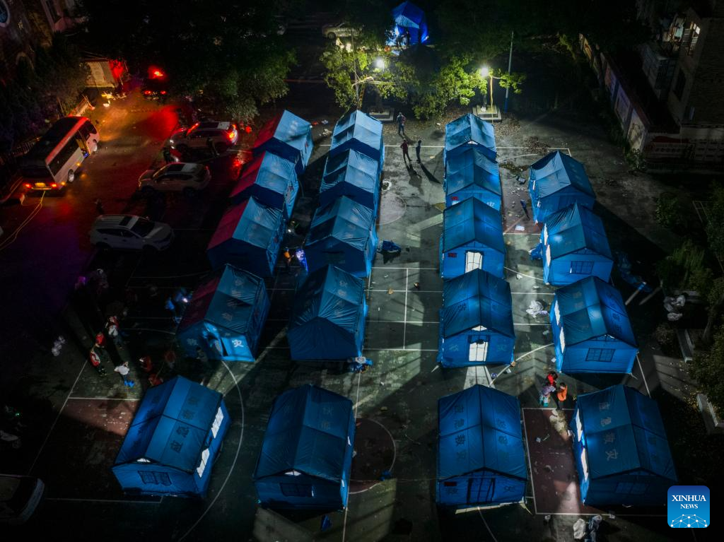 An aerial drone photo shows people living in temporary tents in Congjiang County, southwest China's Guizhou Province, June 24, 2025. Continuous heavy rainfall and upstream inflows have triggered severe flooding in two counties of Guizhou Province in southwest China, prompting mass evacuations.