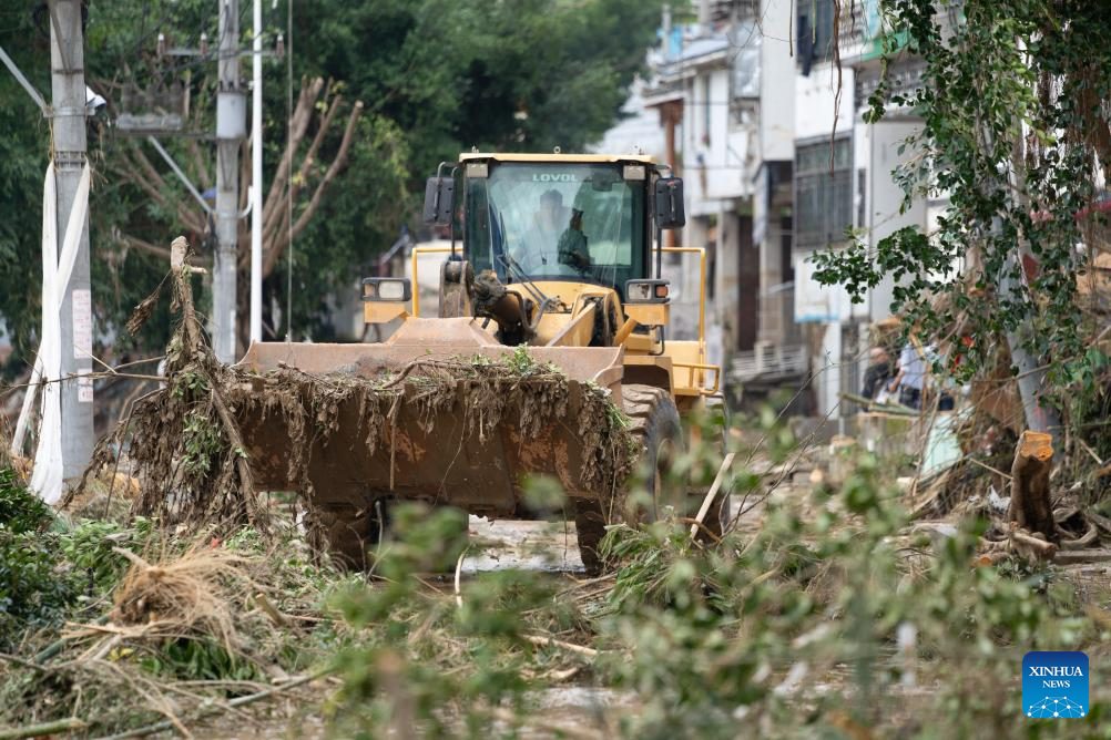A man drives a bulldozer to clear the street in Congjiang County, southwest China's Guizhou Province, June 25, 2025. Continuous heavy rainfall and upstream inflows have triggered severe flooding in two counties of Guizhou Province in southwest China, prompting mass evacuations.