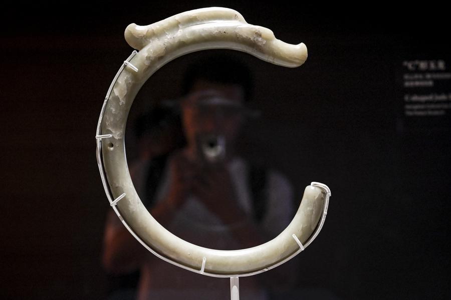 A visitor takes photos of an exhibit during a media preview of the exhibition titled "Legends of Dragon: The Ancient Civilization of Hongshan Culture" at the Shanghai Museum East in east China's Shanghai, June 25, 2025. (Photo by Chen Haoming/Xinhua)