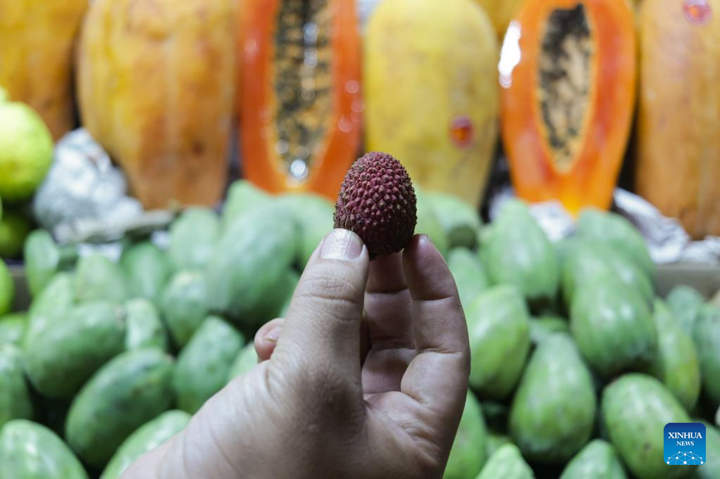 A vendor displays a lychee for sale at a market stall in Mexico City, capital of Mexico, June 24, 2025. (Photo by Francisco Canedo/Xinhua)