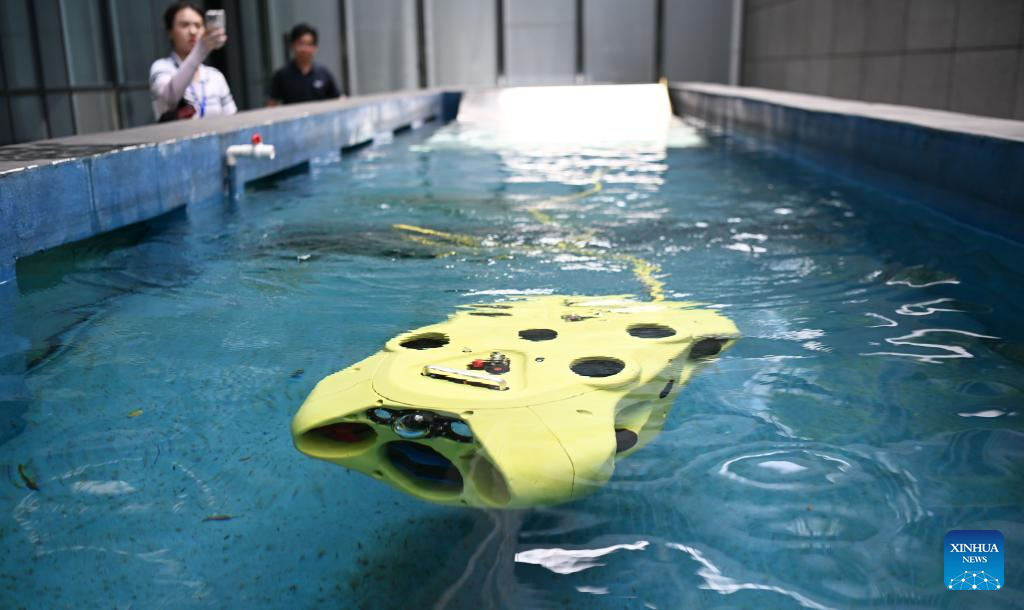 An intelligent underwater robot is tested at a provincial institute of intelligent robotics in Dongguan, south China's Guangdong Province, June 24, 2025. In recent years, Guangdong Province has taken various measures to develop the robot industry. The application and promotion of embodied artificial intelligence robots has been gaining speed in Guangzhou and Shenzhen, and a provincial embodied artificial intelligence robot innovation center was established in Shenzhen. In addition, cities like Foshan, Dongguan and Zhuhai are encouraged to give full play to their manufacturing advantages to build robot production bases.