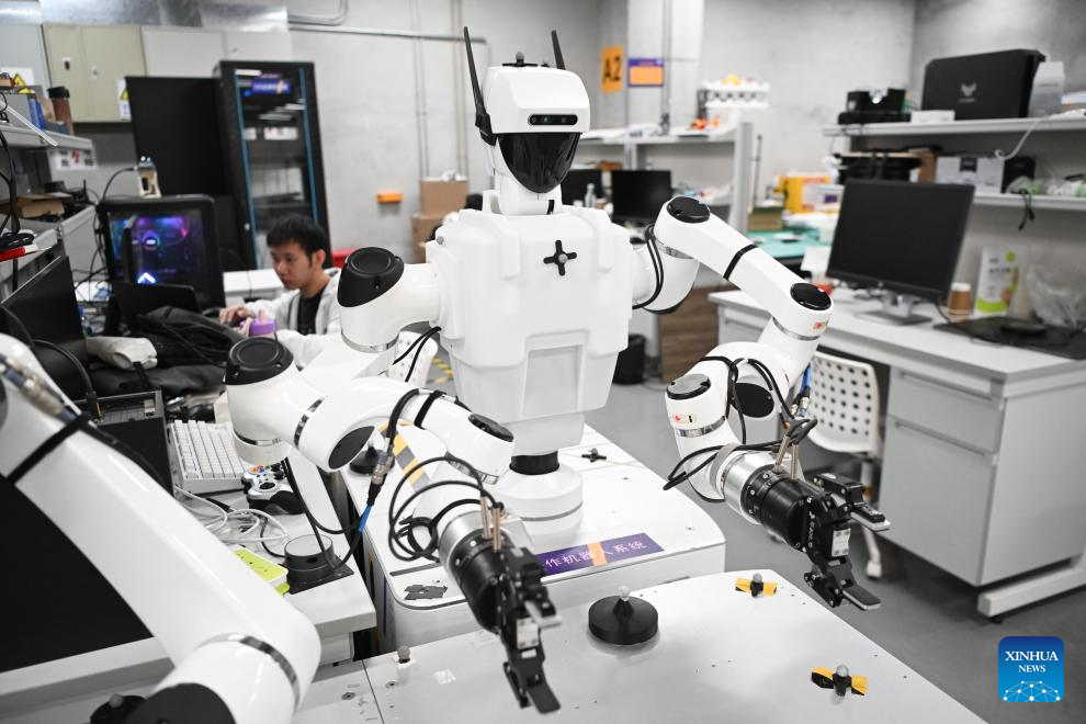A dual-arm collaborative robot system is pictured at a provincial embodied artificial intelligence robot innovation center in Shenzhen, south China's Guangdong Province, June 25, 2025. In recent years, Guangdong Province has taken various measures to develop the robot industry. The application and promotion of embodied artificial intelligence robots has been gaining speed in Guangzhou and Shenzhen, and a provincial embodied artificial intelligence robot innovation center was established in Shenzhen. In addition, cities like Foshan, Dongguan and Zhuhai are encouraged to give full play to their manufacturing advantages to build robot production bases.