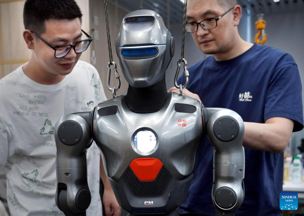Staff members debug a humanoid robot at a robot company in Shenzhen, south China's Guangdong Province, June 25, 2025. In recent years, Guangdong Province has taken various measures to develop the robot industry. The application and promotion of embodied artificial intelligence robots has been gaining speed in Guangzhou and Shenzhen, and a provincial embodied artificial intelligence robot innovation center was established in Shenzhen. In addition, cities like Foshan, Dongguan and Zhuhai are encouraged to give full play to their manufacturing advantages to build robot production bases.
