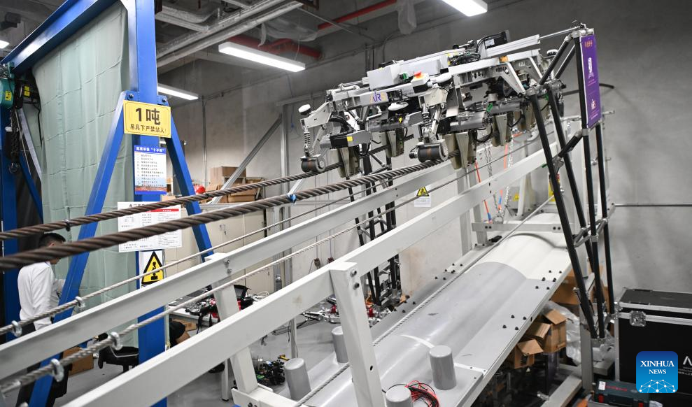 A maintenance robot for main cables of suspension bridge is pictured at a provincial embodied artificial intelligence robot innovation center in Shenzhen, south China's Guangdong Province, June 25, 2025. In recent years, Guangdong Province has taken various measures to develop the robot industry. The application and promotion of embodied artificial intelligence robots has been gaining speed in Guangzhou and Shenzhen, and a provincial embodied artificial intelligence robot innovation center was established in Shenzhen. In addition, cities like Foshan, Dongguan and Zhuhai are encouraged to give full play to their manufacturing advantages to build robot production bases.