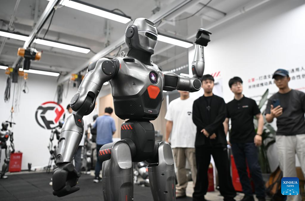 A dancing humanoid robot is pictured at a robot company in Shenzhen, south China's Guangdong Province, June 25, 2025. In recent years, Guangdong Province has taken various measures to develop the robot industry. The application and promotion of embodied artificial intelligence robots has been gaining speed in Guangzhou and Shenzhen, and a provincial embodied artificial intelligence robot innovation center was established in Shenzhen. In addition, cities like Foshan, Dongguan and Zhuhai are encouraged to give full play to their manufacturing advantages to build robot production bases.