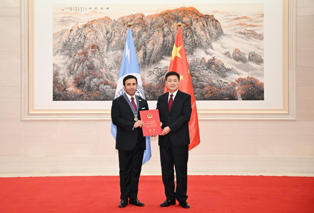 Chinese State Councilor and Minister of Public Security Wang Xiaohong meets with International Criminal Police Organization (Interpol) President Ahmed Nasser Al-Raisi and awards him the Gold Great Wall Commemorative Medal in Beijing, capital of China, June 26, 2025. (Xinhua/Xie Huanchi)