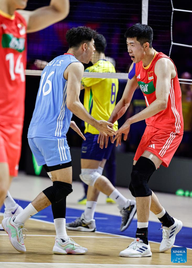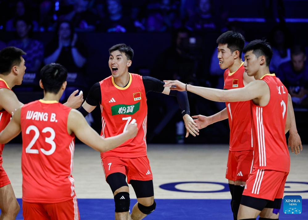 Players of China celebrate scoring during the Pool 5 match between China and Brazil at the Men's Volleyball Nations League (VNL) 2025 in Chicago, the United States, June 26, 2025. (Photo by Joel Lerner/Xinhua)