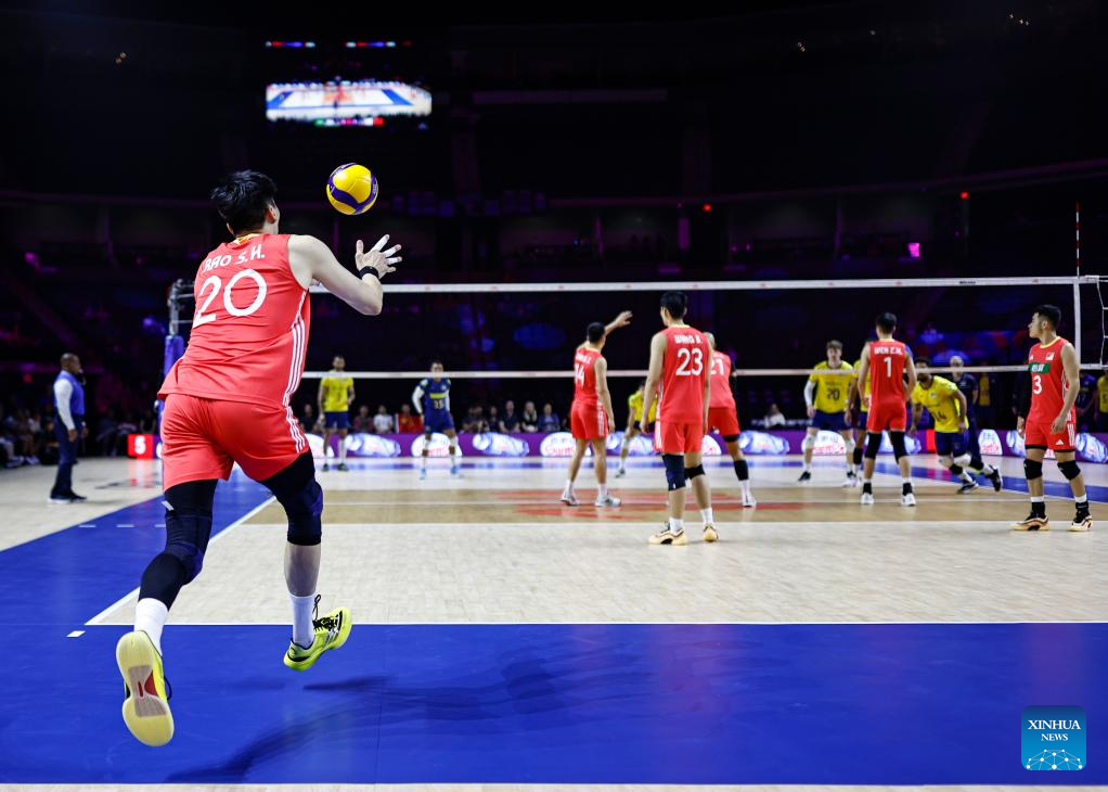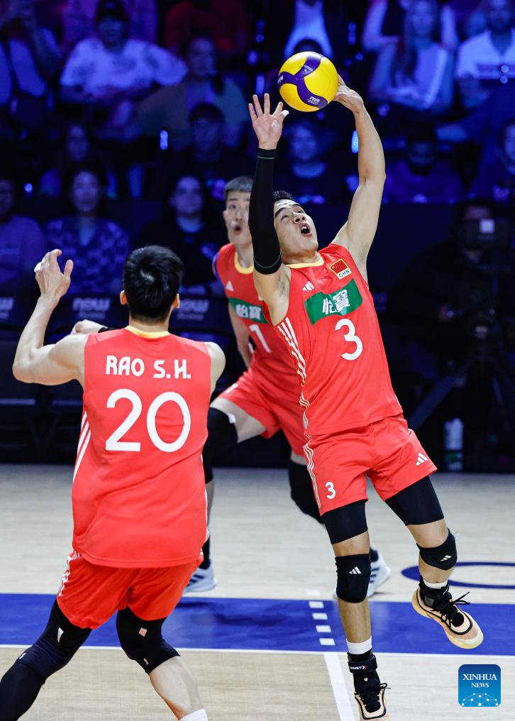 Wang Hebin (R) of China sets the ball during the Pool 5 match between China and Brazil at the Men's Volleyball Nations League (VNL) 2025 in Chicago, the United States, June 26, 2025. (Photo by Joel Lerner/Xinhua)