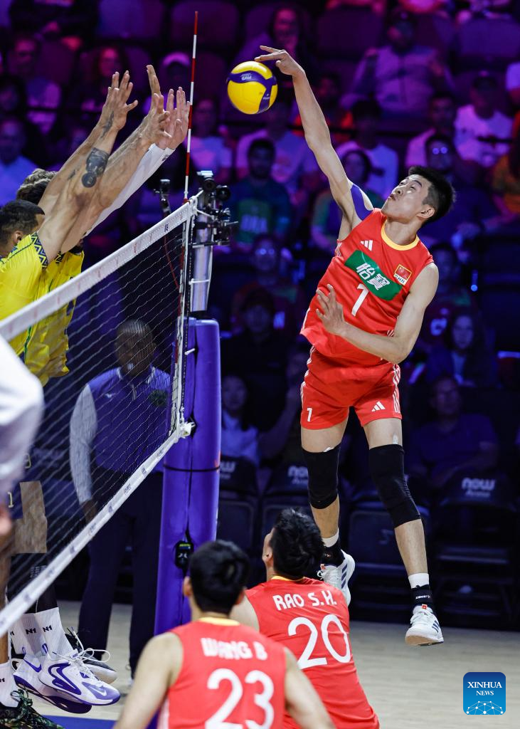 Li Yongzhen (top R) of China spikes the ball during the Pool 5 match between China and Brazil at the Men's Volleyball Nations League (VNL) 2025 in Chicago, the United States, June 26, 2025. (Photo by Joel Lerner/Xinhua)
